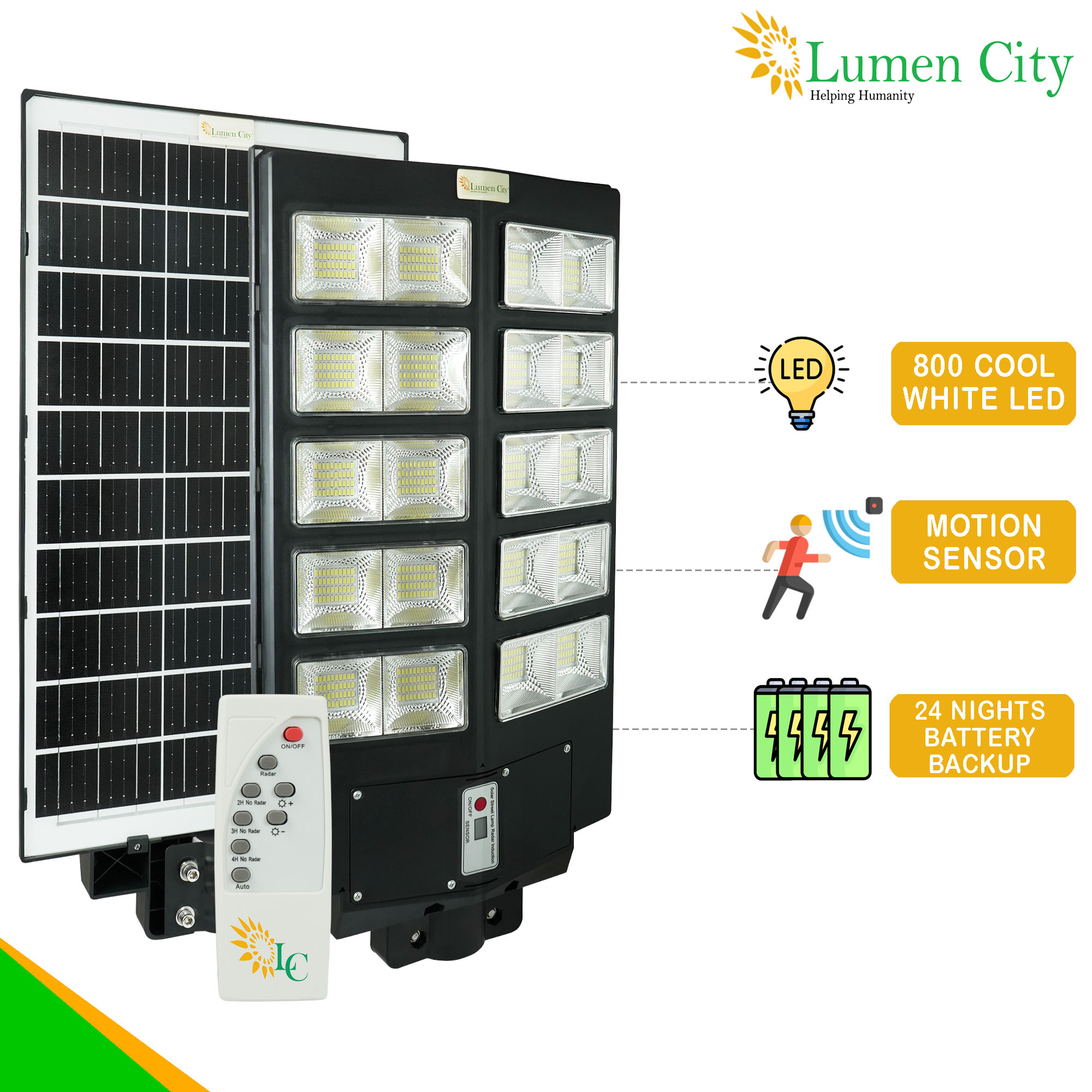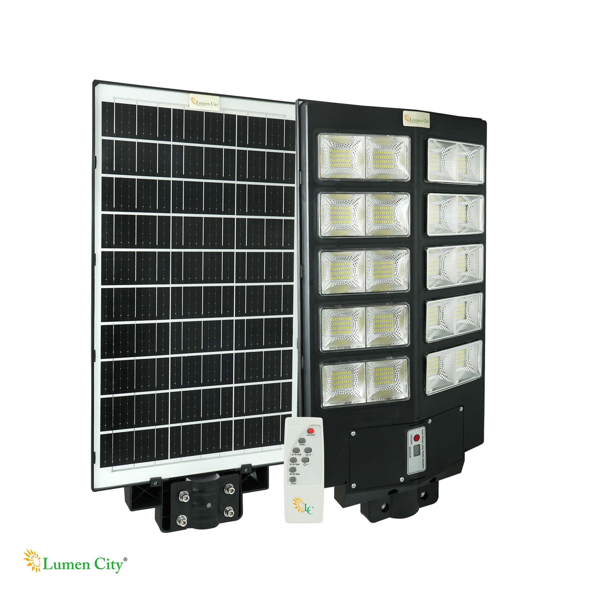 The Aero Model 1185 incorporates the identical radar sensor and remote control system as the 20W variant, with the same operational mode set: OFF, ALWAYS, INDUCTION, and 2H, 4H, and 6H timed induction. The sensor’s 10% startup, 100% active, and 15% post-motion dimming logic is even more critical at 300W LED output — without sensor-based power management, constant 300W draw would exhaust even the 30Ah LiFePO4 battery before achieving 12 Hours of operation. The intelligent dimming system reduces average power consumption to approximately 30–40% of rated output across a typical overnight cycle on medium-traffic roads, extending effective runtime well beyond the rated 2-night figure in low-traffic conditions. For housing society main roads and industrial estate access tracks — where 300W output is needed during peak hours but can be reduced during the 2–5 AM low-activity window — the 4H and 6H induction modes provide the most energy-efficient configuration.