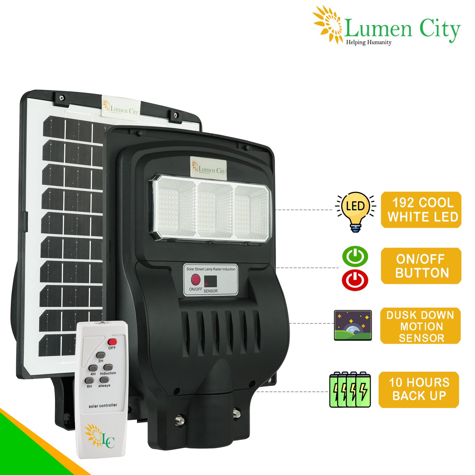 The Star Model 1248 is equipped with a radar-based motion sensor and a wireless remote control providing multiple operating modes to suit varied residential and garden lighting applications. The sensor operates with 10% optical brightness initially, activates to 100% on motion detection, then holds at 15% after 30 seconds of no movement — a three-state dimming sequence that maximises the 5Ah battery’s single-night runtime on low-traffic colony footpaths and garden boundary perimeters where sustained full brightness is rarely required. Remote control modes include OFF (full dusk-to-dawn switch-off), ALWAYS (motion sensor disabled, constant dusk-to-dawn illumination), INDUCTION (full radar-active dusk-to-dawn), and timed induction modes at 2H, 4H, and 6H. The 2H and 4H modes are particularly suitable for residential garden and society gate lighting where activity is concentrated in the early evening and overnight full-brightness illumination is neither required nor desirable for adjacent sleeping residents.