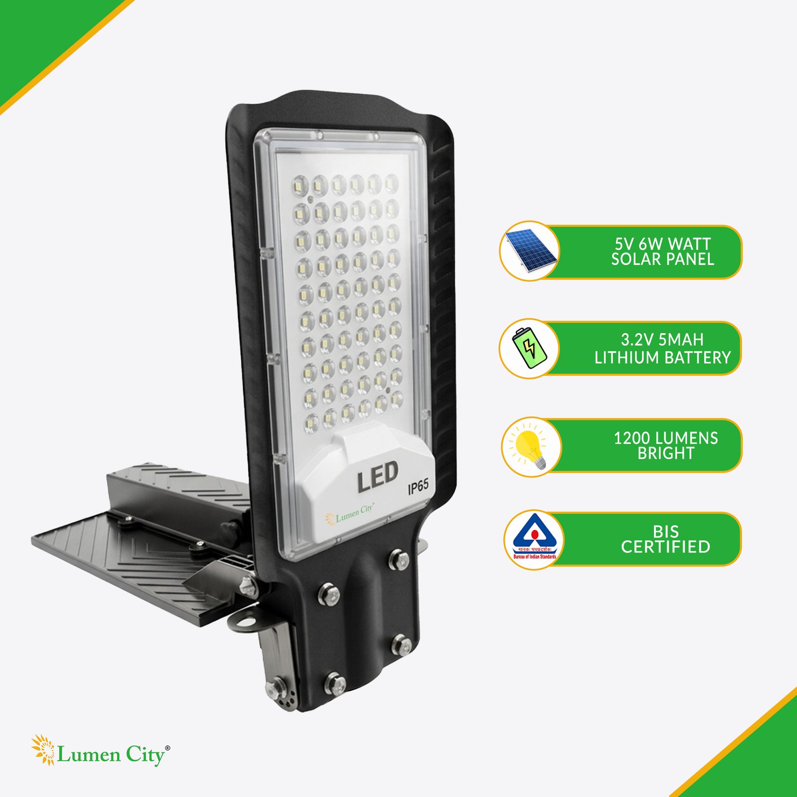 The 5W Solar Street Light Model 1366 measures 33 x 16.5 x 6 cm and carries IP65 waterproofing. IP65 certifies complete dust protection and water jet resistance for permanent outdoor installation across India’s full climate range — monsoon rainfall, coastal salt-air, and UV/dust exposure. The all-in-one housing integrates the LED array, adjustable 5V 6W MONO panel, 3.2V 5Ah LiFePO4 LiFePO4 battery, PIR sensor, and remote receiver in a single sealed IP65 unit. The adjustable panel is a hinged extension of the IP65 housing — physically repositioned at installation and secured at the optimal solar irradiance angle.