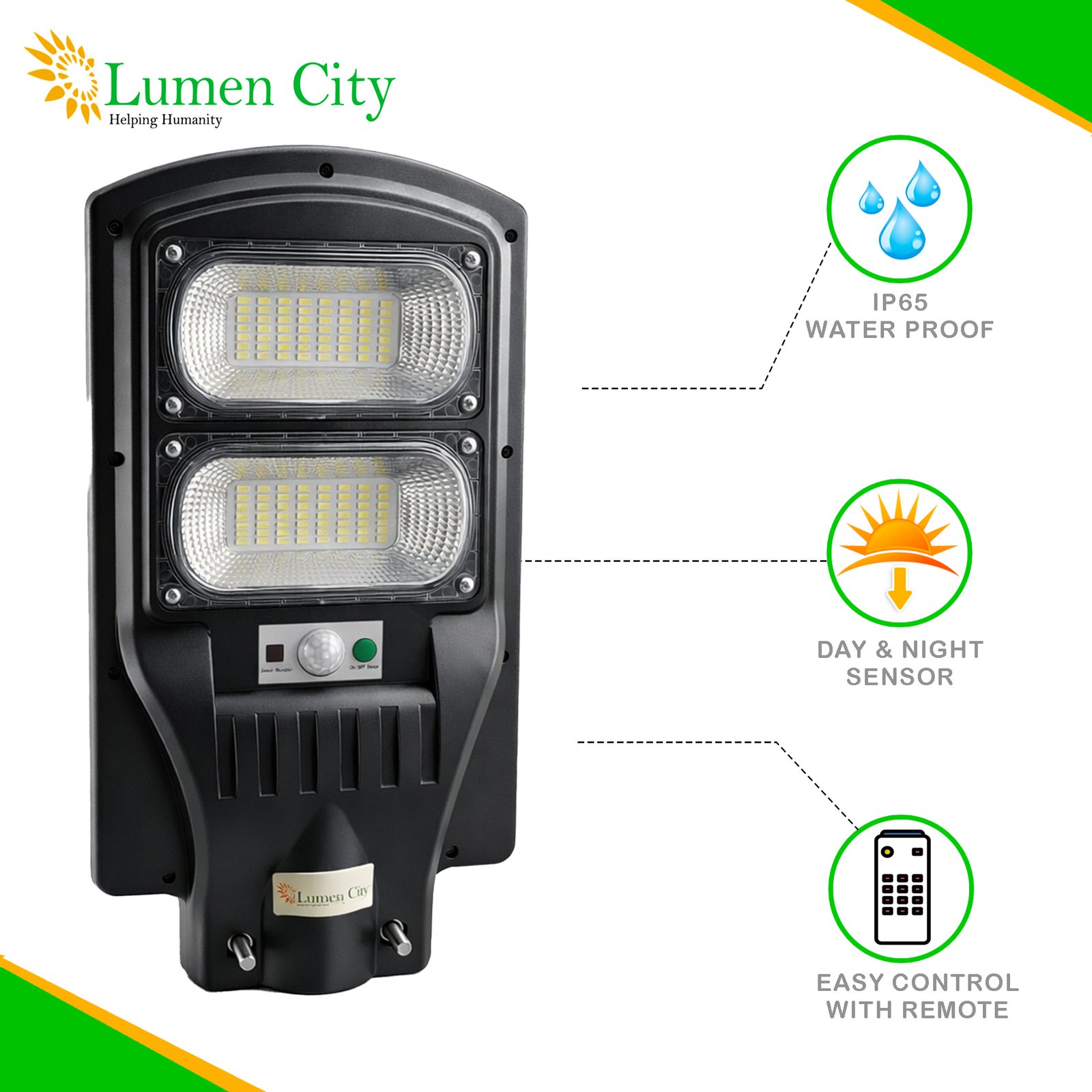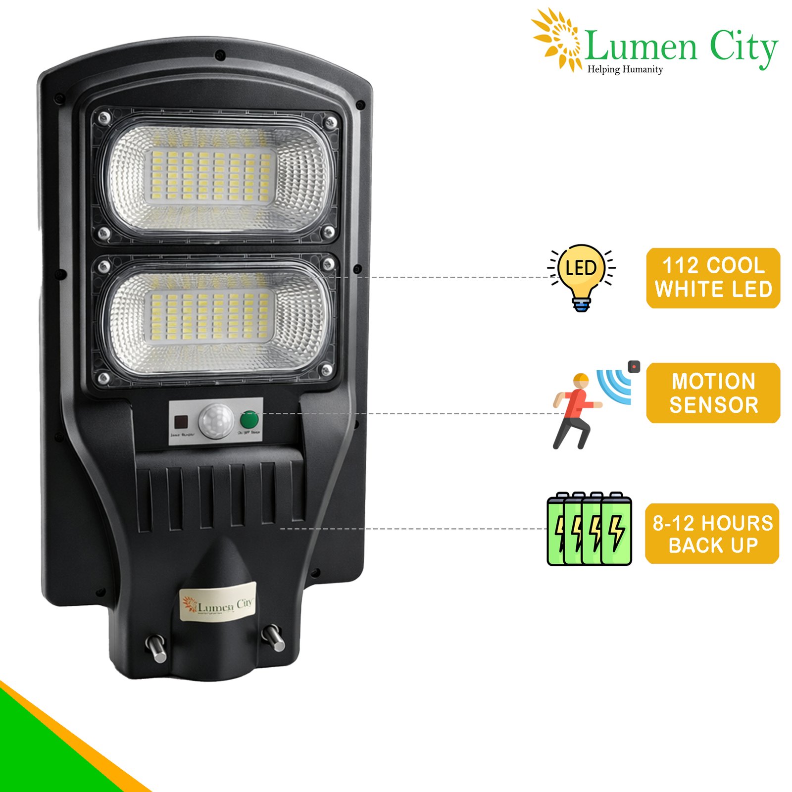 The 1118 features the identical radar sensor and remote control system as the 3W model: OFF, ALWAYS, INDUCTION, and 2H, 4H, 6H timed modes. At 60W output, the sensor dimming (10% startup, 100% active, 15% post-motion) reduces average consumption to approximately 20–25W across a low-traffic overnight cycle, enabling 8–12 hour battery runtime from the 12Ah LiFePO4 cell. The 6H induction mode suits housing society main pedestrian corridors where peak evening activity (6 PM–midnight) warrants full brightness and a reduced-brightness standby mode through the remaining early-morning hours. The remote control enables facility management staff to adjust modes without physical access to each pole, reducing maintenance overhead in multi-light colony and society installations.