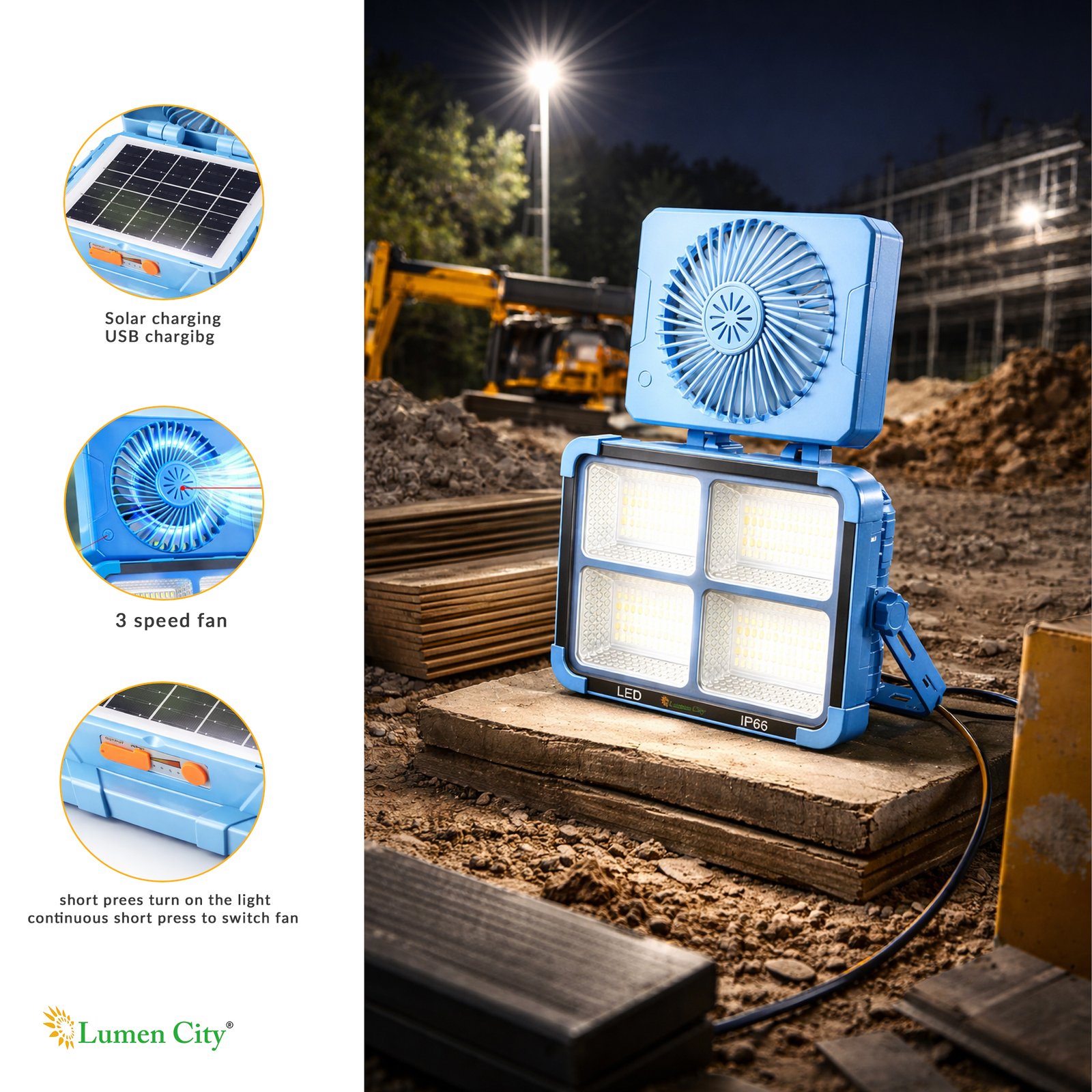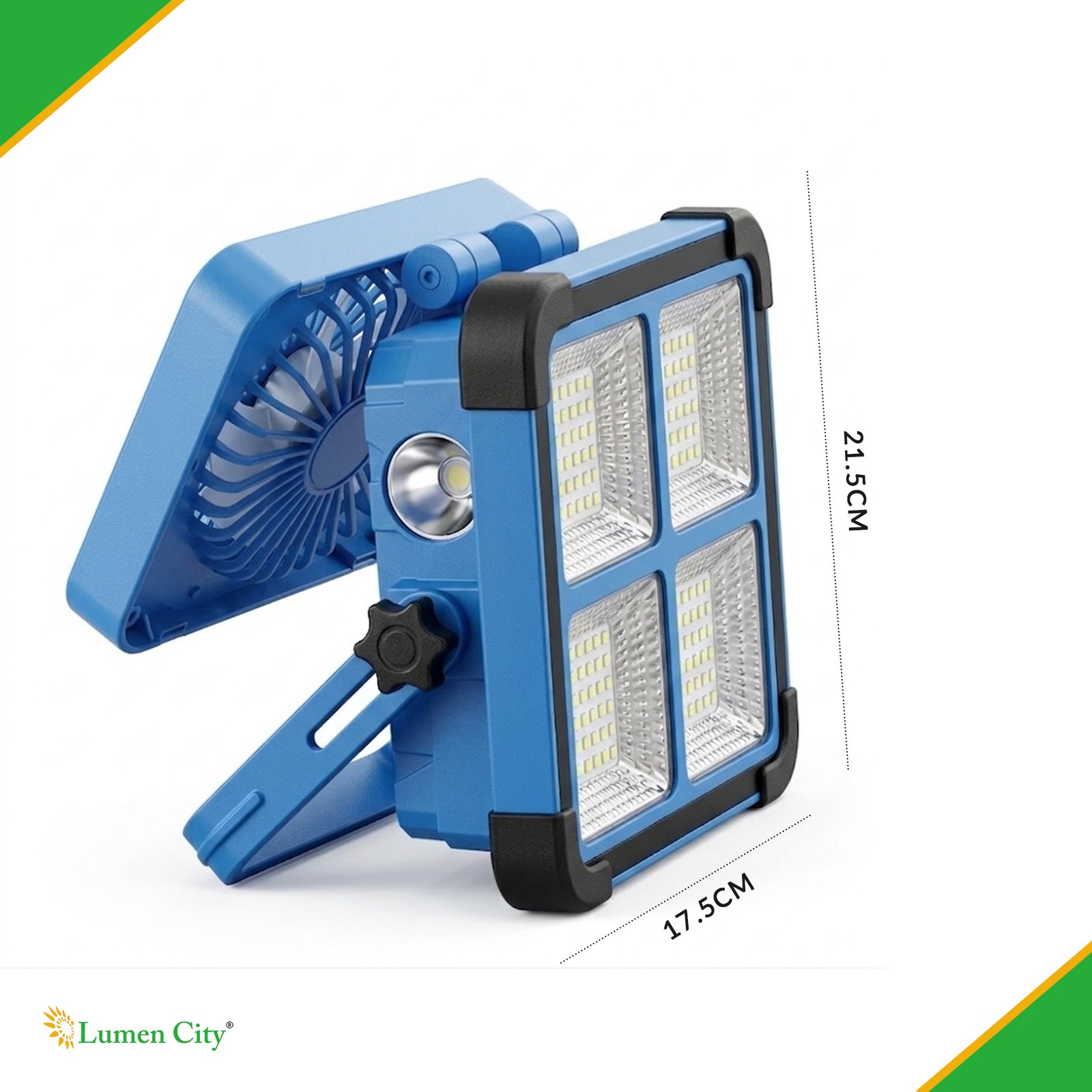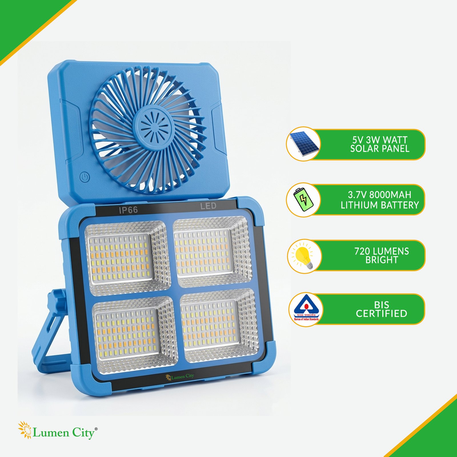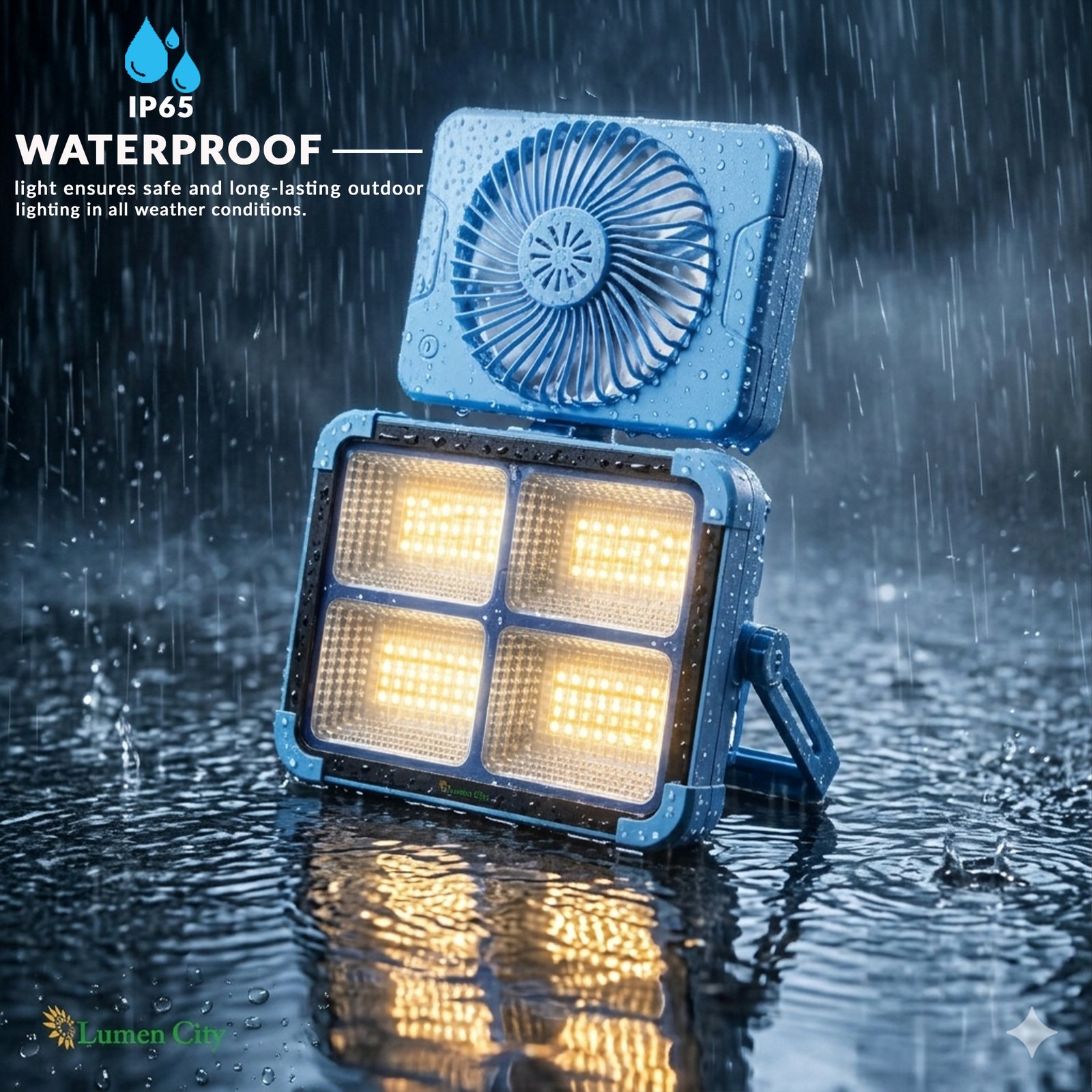 The 6W Solar All-in-One Emergency/Camping Light 4 Reflector with Fan (Model 1381) is a portable, off-grid solar-rechargeable emergency and camping light with a confirmed 3-speed integrated fan — the most feature-complete model in the LumenCity solar camp light range — and dual Solar/Type-C USB charging, designed for camping and trekking trips, power-cut emergency home lighting, rural area off-grid homes, farmhouse outdoor event lighting, construction site temporary lighting, housing society common area emergency backup, and any Indian indoor or outdoor environment requiring portable solar-charged multi-mode LED illumination with integrated fan cooling and USB charging capability. Featuring 288 Pcs 5730 at 100W LED power, a 3.7V 8000mAh battery providing 8-12 hours of backup, a 5V 3W solar panel, dual Solar/Type-C USB charging, CW/NW/WW/WARNING colour and mode options, IP65 weatherproofing, and a compact 21.5 x 17.5 x 5.5 cm housing, the Model 1381 is the premium model in the LumenCity solar camp light series. Backup time varies according to lighting mode as confirmed in the product specification footnote.