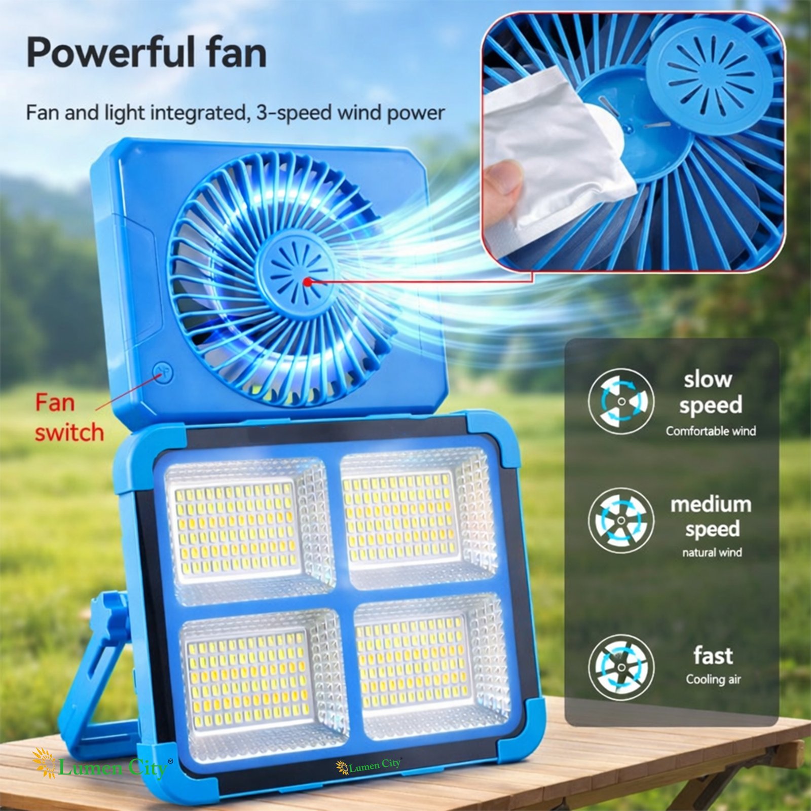 - Tent cooling and lighting combined — 3-speed fan for summer camping in India