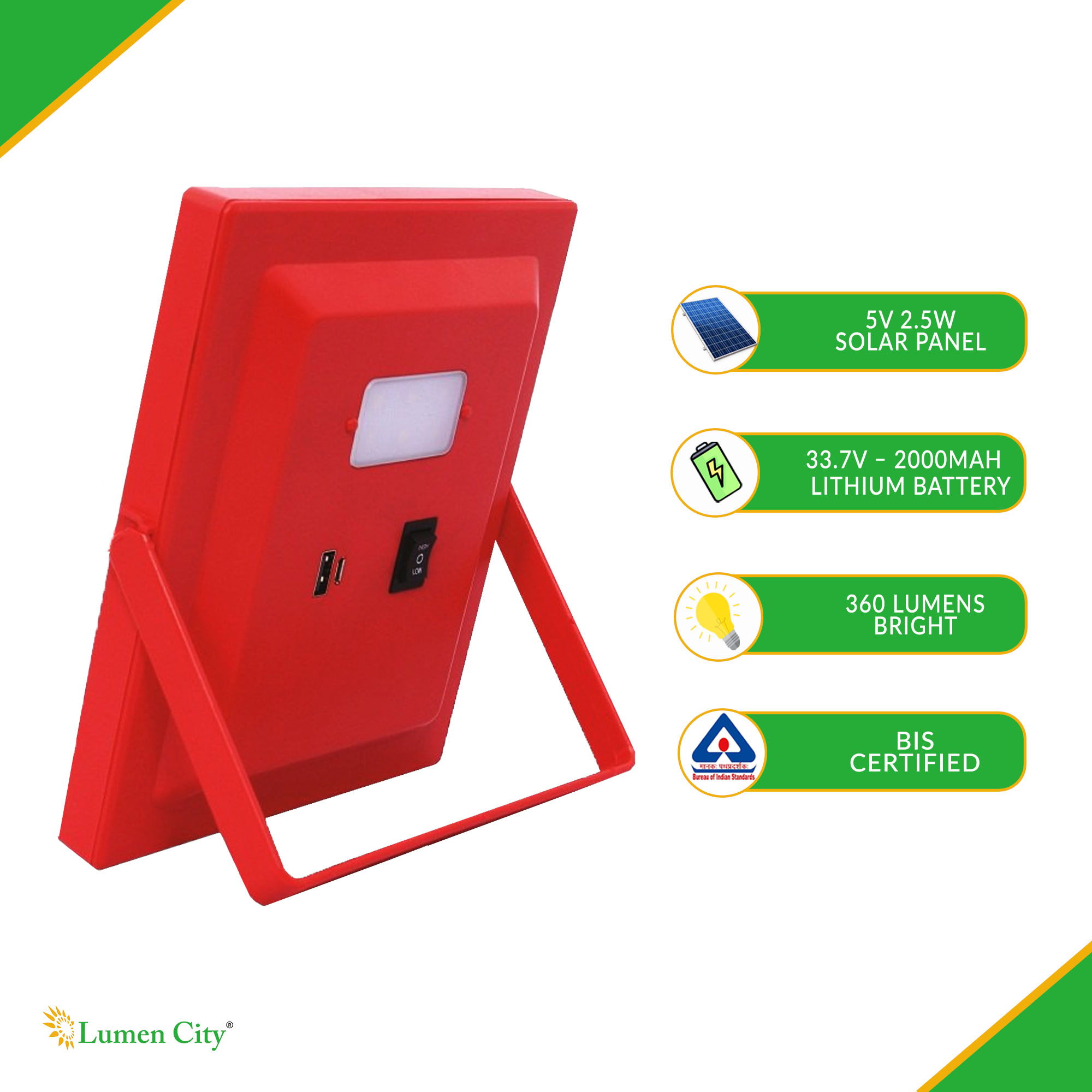The 3W Solar Flood Light carries an IP65 ingress protection rating. This means the unit is fully protected against dust ingress and water jets from any direction, making it suitable for outdoor installation in monsoon-prone regions across India. The compact body measures 18 x 18 x 7 cm and is constructed with a durable plastic housing available in a striking red finish. The built-in foldable stand allows the unit to be placed on flat surfaces and angled towards the sun for optimal solar charging without requiring any mounting hardware.