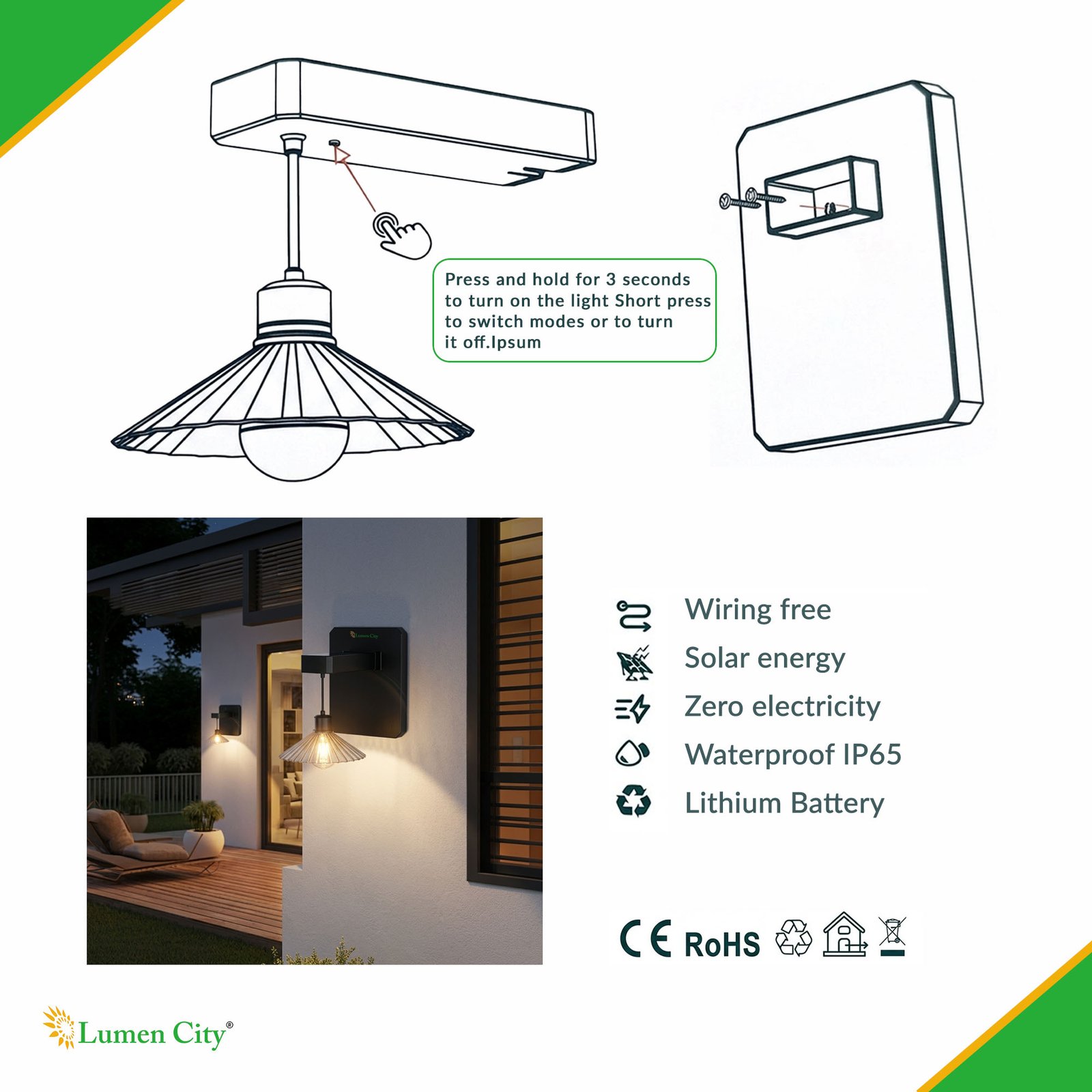 The Solar Wall Light Shadow Model 1384 installs on any outdoor wall surface without external wiring, underground cable, or mains power connection. The wall mount installation type — confirmed in the product specification — requires only standard masonry screws and wall plugs suitable for the Indian brick, concrete, and stone wall constructions used in housing colony boundary walls, housing society compound gate pillars, farmhouse exterior facades, and hotel courtyard perimeter walls. Installation involves marking the fixing positions on the wall surface, drilling and plugging, and securing the wall bracket — a process completed in under 10 minutes per unit by general site workers or housing society maintenance staff without specialist training. The unit’s self-contained all-in-one housing eliminates the electrician engagement, conduit installation, junction box fitting, and switch wiring required for conventional wired wall sconces — a combined materials and labour saving relevant for housing society management committees and colony developers specifying warm-white decorative wall lighting for compound entrance and boundary wall applications. At 30 units per carton, the Model 1384 is procurement-ready for housing colony entrance wall lighting, hotel and resort courtyard perimeter wall schemes, farmhouse exterior facade lighting, and housing society compound gate pillar decoration projects across India.