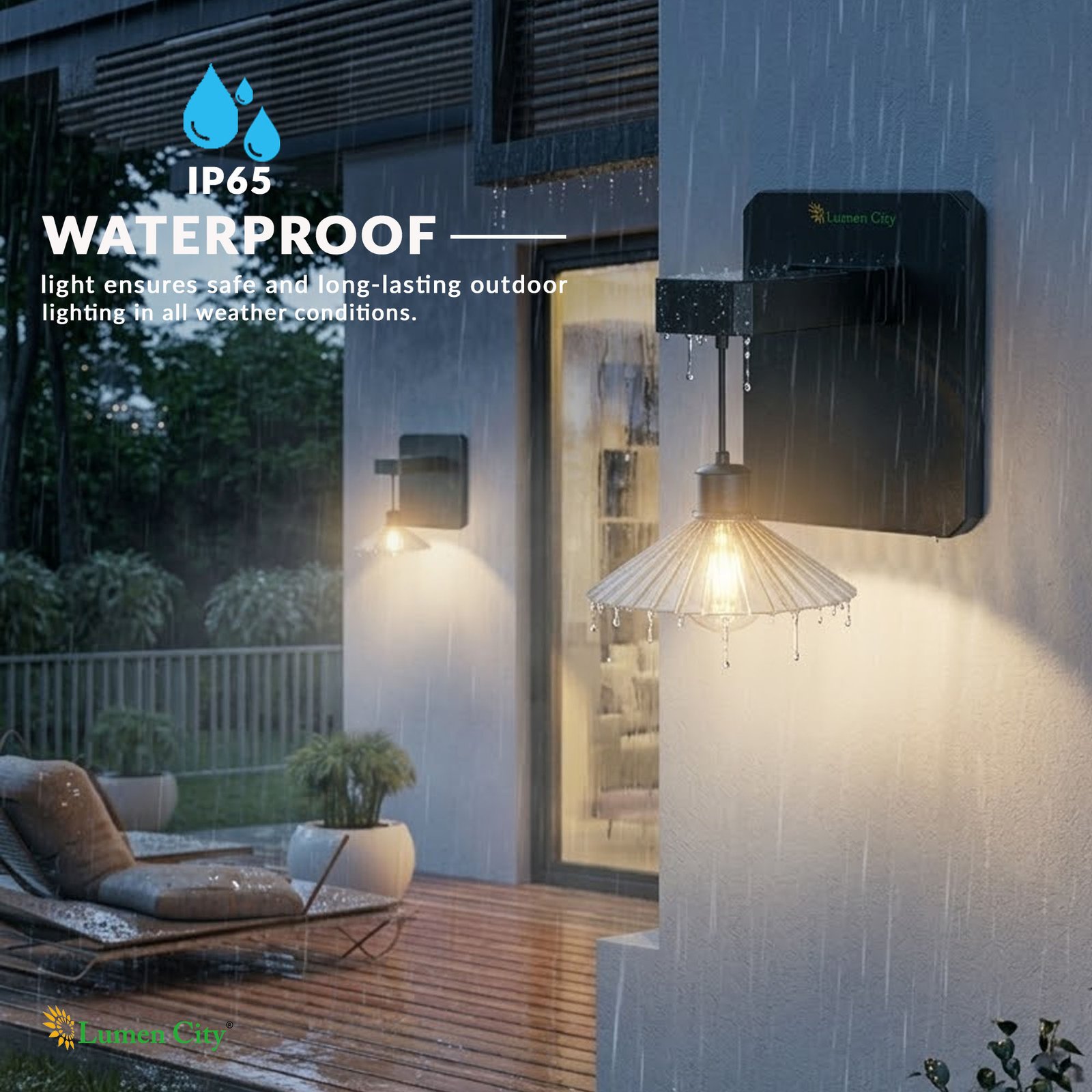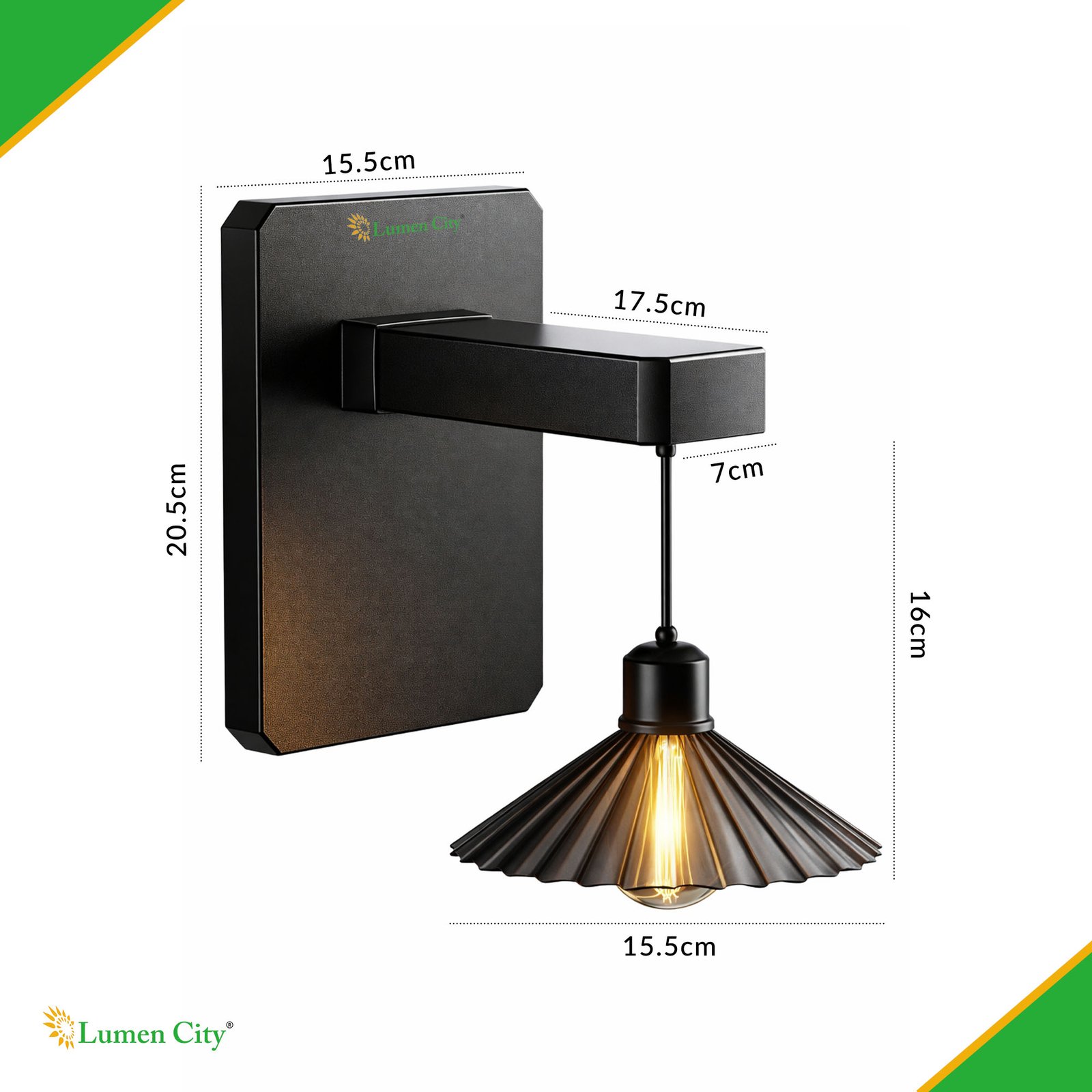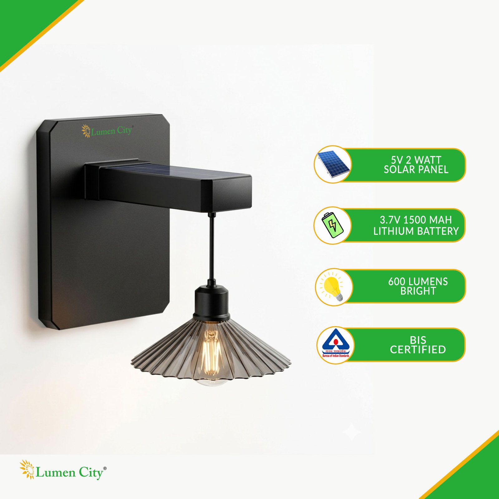 The Solar Wall Light Shadow Model 1384 carries an IP65 weatherproofing rating, confirming complete dust ingress protection and resistance to water jets from any direction. IP65 is the confirmed outdoor standard for solar wall lights deployed year-round in India and is the top safety qualifier cited by buyers in both IndiaMart RFQs and Amazon.in product searches for solar wall lamps. The rating protects the internal Tungsten Style LED array, driver circuitry, and 1500mAh battery from the monsoon rainfall of Kerala, Maharashtra, and the Western Ghats; the salt-air coastal humidity of Goa, Mumbai, Puducherry, and Chennai; and the dust and UV exposure of Rajasthan, Punjab, and Gujarat during peak summer months. At 200 x 182 x 165 mm, the Shadow Model 1384 is a compact wall sconce form factor — the smallest of the LumenCity Shadow Model range — with the solar panel integrated into the top panel of the housing and the Tungsten Style LED luminaire suspended below on a visible mount arm that creates the characteristic shadow effect on the wall surface. The all-in-one housing integrates panel, battery, LED driver, and luminaire within the single wall-mounted unit.